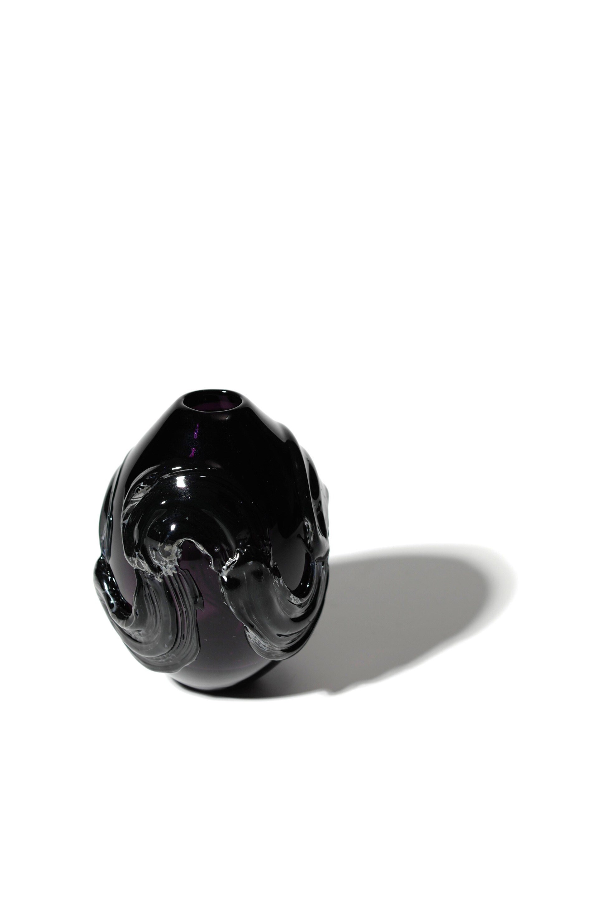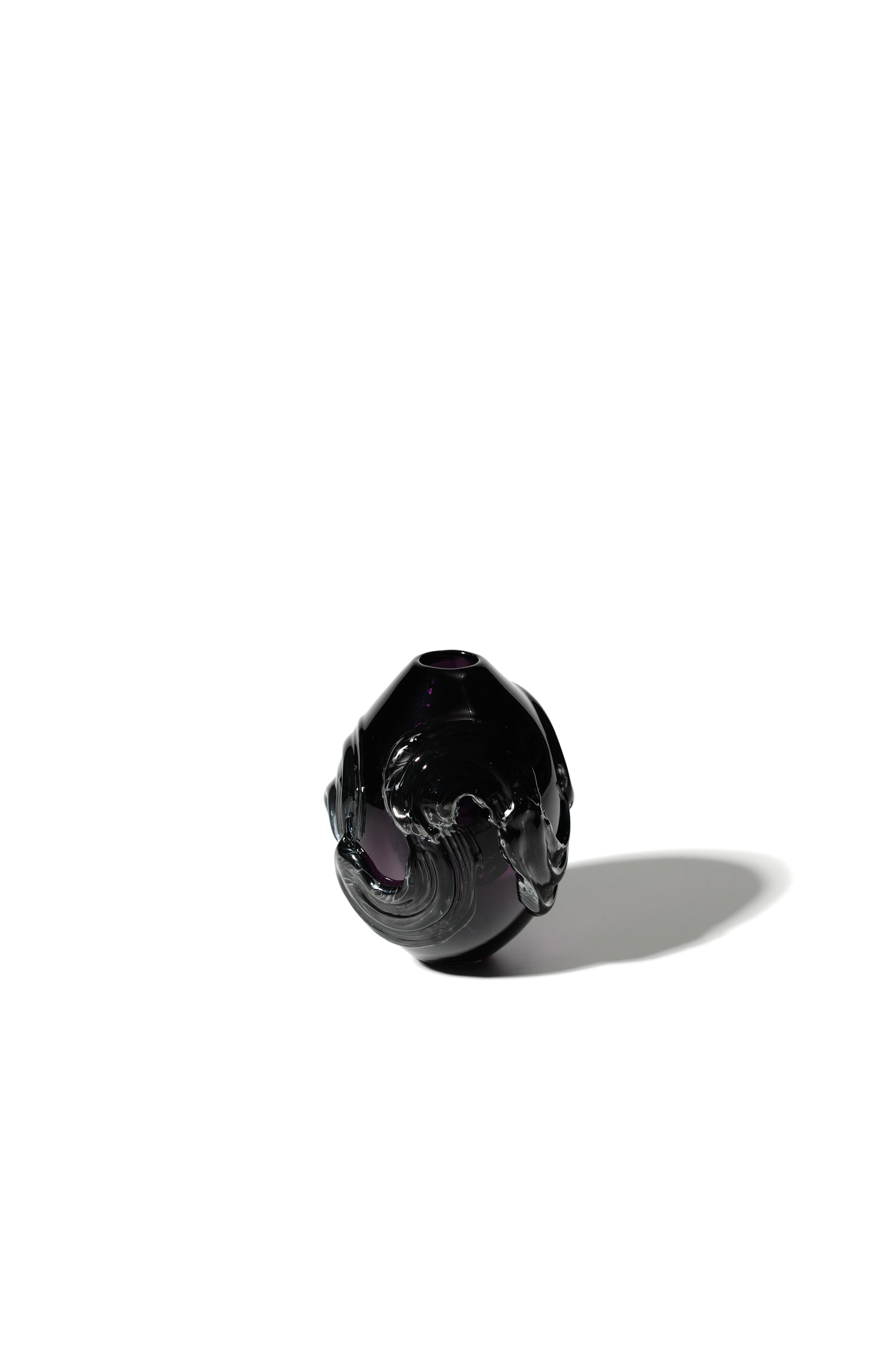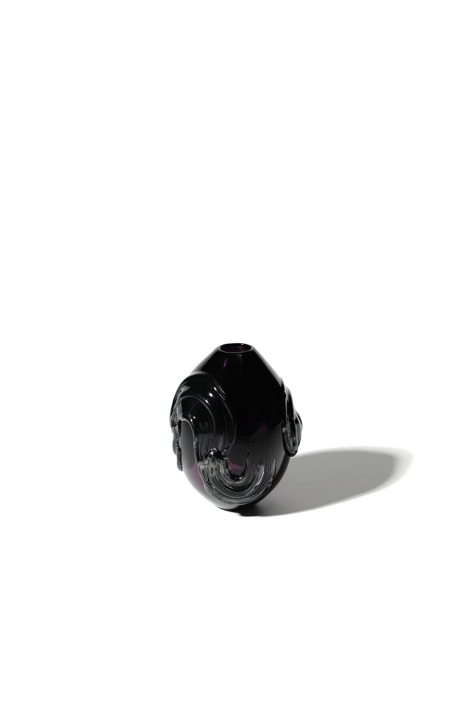 반투명의 둥근 기형에 검은 유리획이 더해져 오묘하고 세련된 느낌을 자아내는 오브제입니다. 모난 곳 없이 완만한 곡선을 가진 항아리 모양은 복을 불러오는 풍요를 상징하며, 유리의 농담을 통해 그려진 획은 작품의 특별한 고유성을 투영합니다. 오묘한 질감을 가진 작가의 작품은 너무 크지도, 작지도 않은 적당한 형태로 어느 공간에서도 은은한 존재감을 발휘합니다.