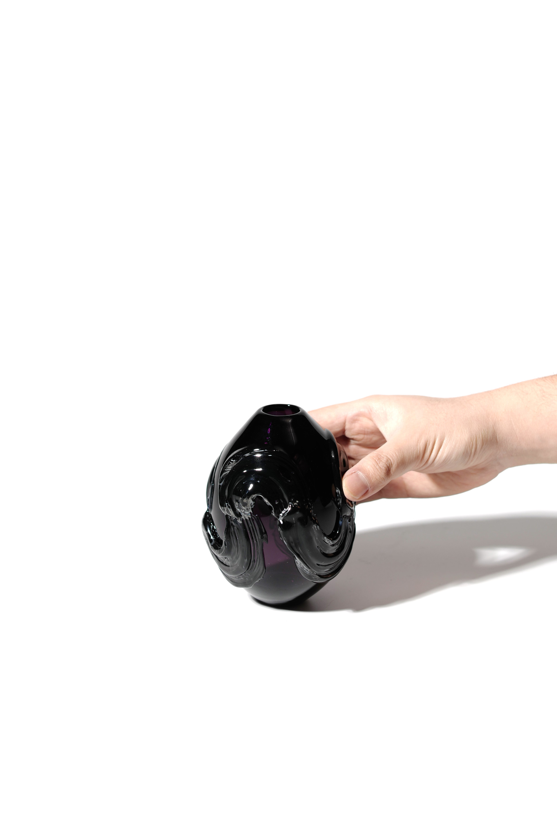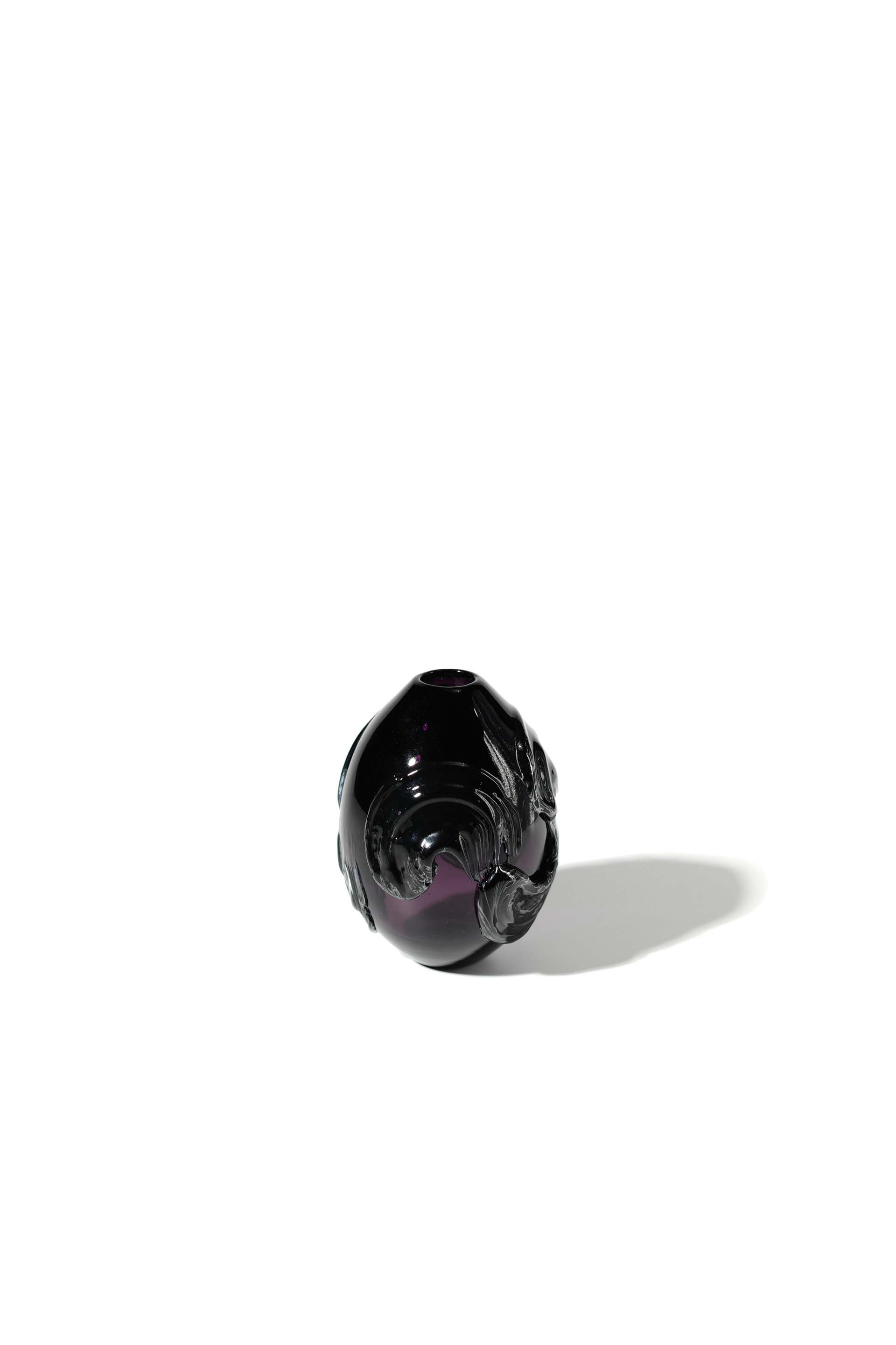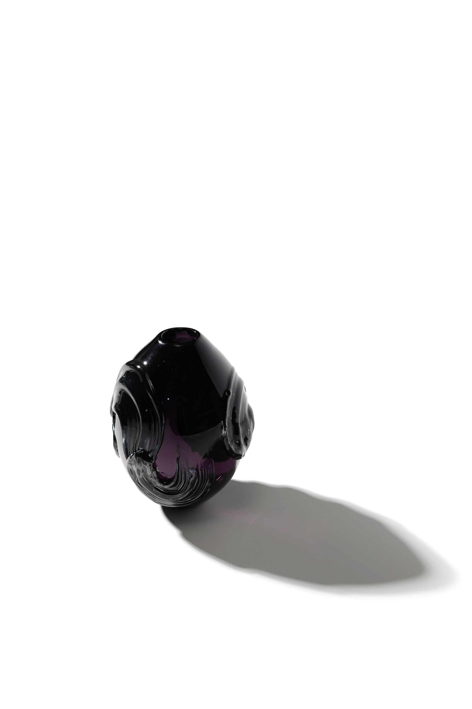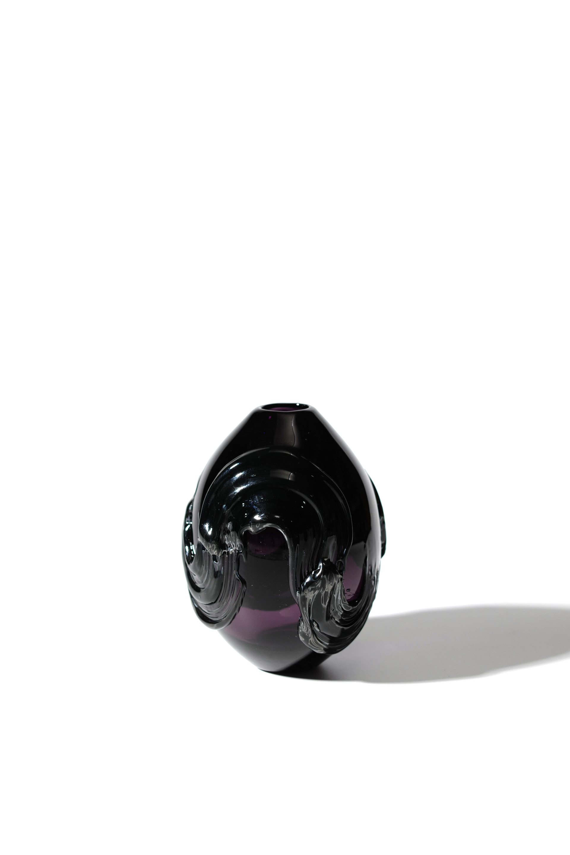 반투명의 둥근 기형에 검은 유리획이 더해져 오묘하고 세련된 느낌을 자아내는 오브제입니다. 모난 곳 없이 완만한 곡선을 가진 항아리 모양은 복을 불러오는 풍요를 상징하며, 유리의 농담을 통해 그려진 획은 작품의 특별한 고유성을 투영합니다. 오묘한 질감을 가진 작가의 작품은 너무 크지도, 작지도 않은 적당한 형태로 어느 공간에서도 은은한 존재감을 발휘합니다.